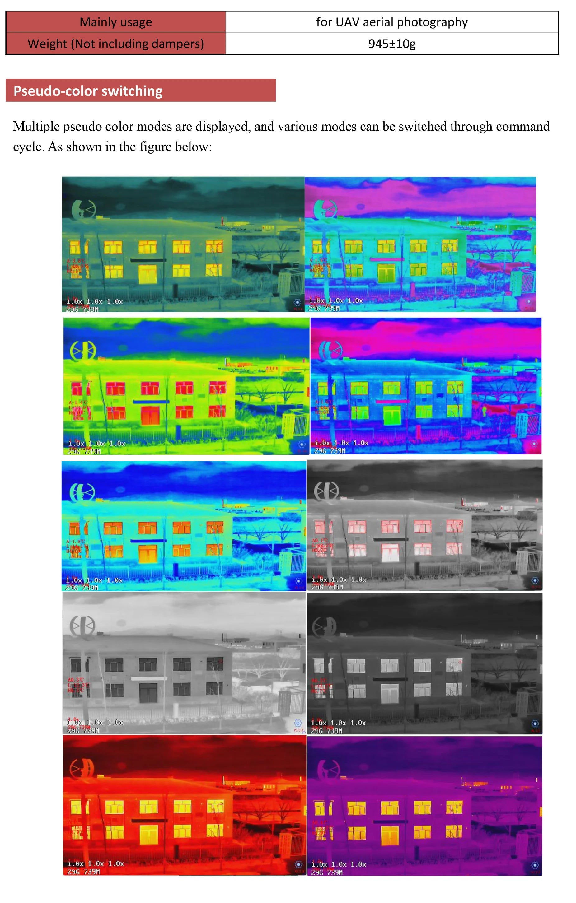 GWD-30G613 is a drone gimbal payload which integrating 30x optical zoom camera, with 640*512 Infrared thermal camera, and 3-axis stabilized PTZ. Both cameras support 9x digital zoom. It adopts IP/HDMI dual output. The visible light camera uses a wide dynamic sensor with 2 mega effective pixels; Thermal camera adopts 640x512 resolution vanadium oxide detector with baffle design. The system supports network RTSP picture-in-picture code stream output, multiple picture-in-picture modes, and multiple pseudo-color switching. The UART and IP can synchronously control the camera and PTZ, and support local TF storage. All metal shell is adopted. This thermal imaging lens has a focal length of 13mm.
