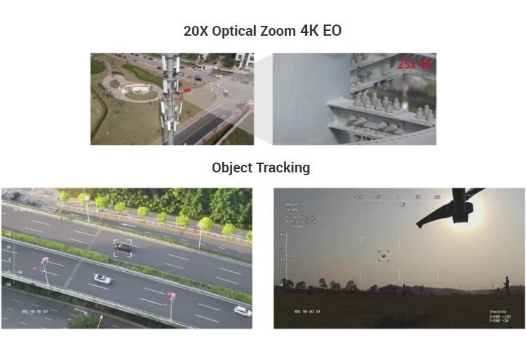 Q20T features 20x optical zoom 4K EO and auto tracking function. It is a 3-axis gimbal camera for UAV, Alluminum alloy hosing is ideal for light weight meanwhile keeping perfectly anti-interference and cooling. It outputs and records FHD 1080p video with OSD.